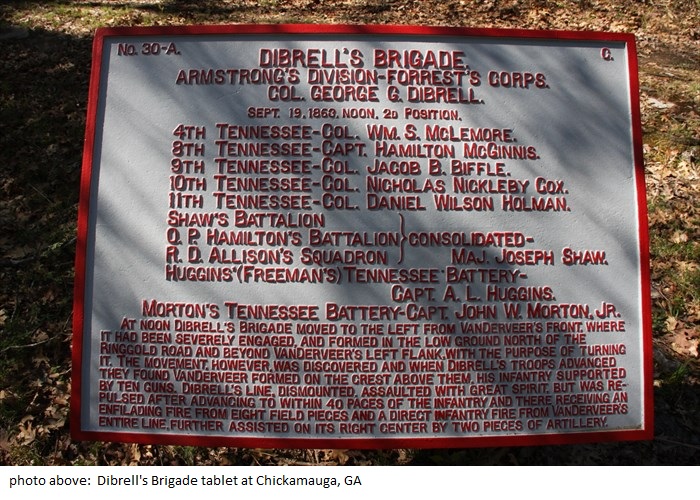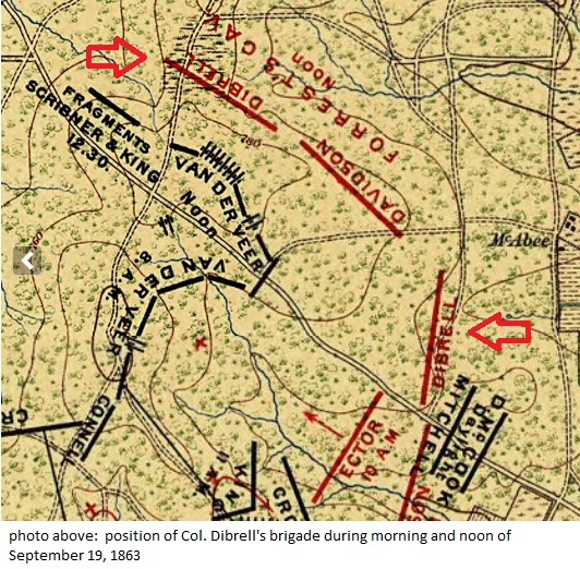According to Civil War Virtual Tours (internet), at or about 8:30AM on Saturday, September 19, 1863, General Forrest brings up Dibrell’s Brigade to reinforce Davidson’s Brigade of 1,600 cavalrymen north and west of Jay’s Mill. They were engaging Col. Croxton’s (US) 2,200 man brigade.
