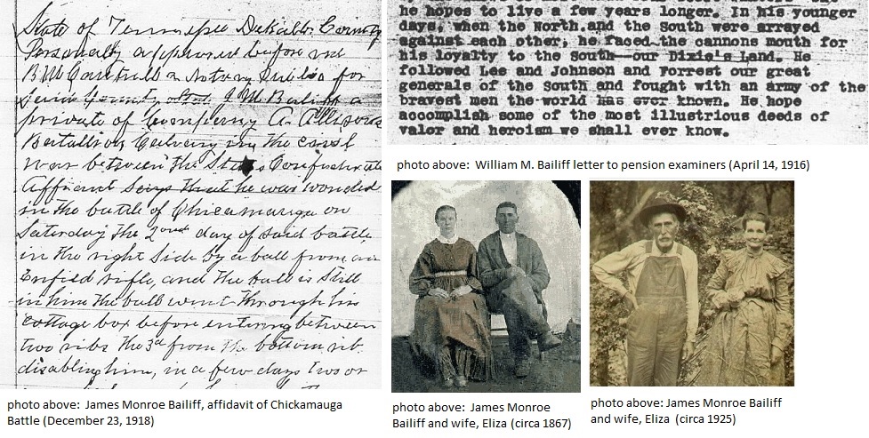 In a letter to the Tennessee State Board of Pension Examiners dated April 14, 1916, William M. Bailiff (son of Monroe Bailiff) writes: