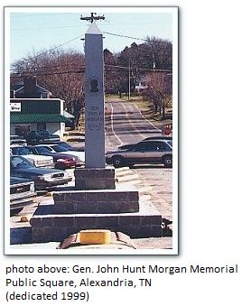 The Gen. John Hunt Morgan Monument was installed on the Alexandria city square in 1999 and sets on a three tiered base filled with concrete and steel reinforcement. The main stone weighs 9,000 lbs. and has a bronze relief of the General. On each side there is a brief history of two of the General's raids which started from this location, "The Christmas Raid" and his "Ohio Raid". On the remaining side is the SCV logo.